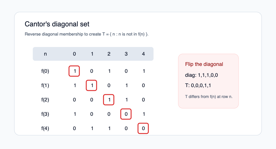 這個工具把 Cantor 對角論證變成表格,顯示為甚麼任何列表都不能包含所有子集。
