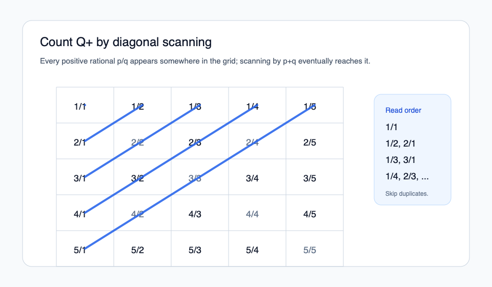 圖示。對角掃描不是裝飾,而是將正有理數的二維格點轉成一條序列的機制。