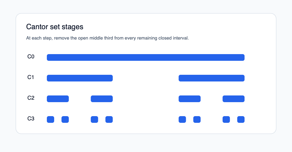 Cantor 集看起來像碎塵,因為每個尺度都有開區間被移走。但基數定理說明: 它仍然有和實數線一樣多的點。長度和基數是不同量度。
