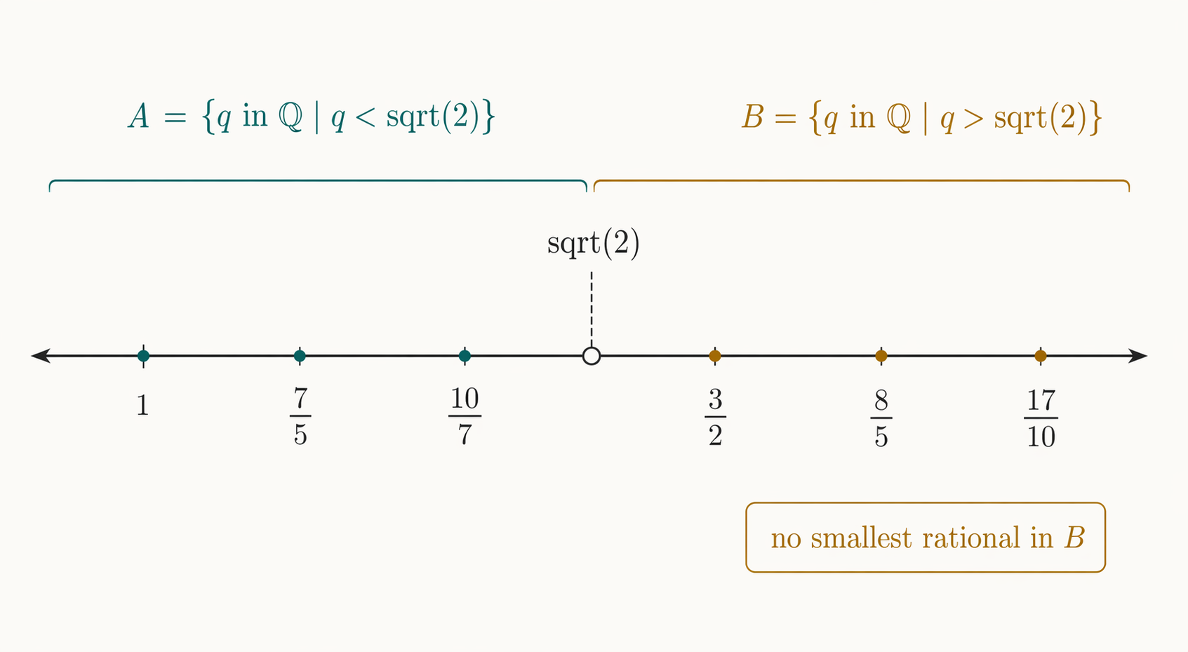 沒有任何有理數等於 sqrt(2),所以右側有理數永遠不會從某個最小元開始。這正是無理 cut 的特徵。