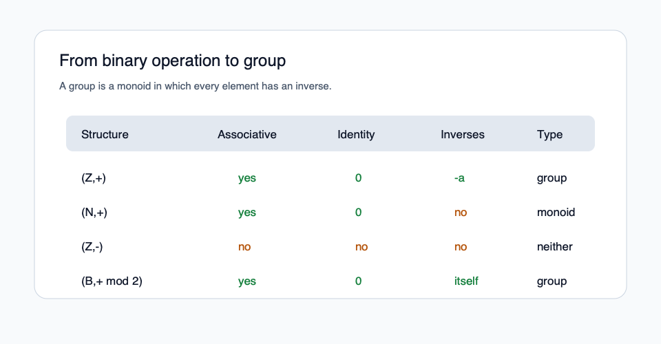 這個檢查器按 monoid 與 group 所需的精確公理比較二元運算。